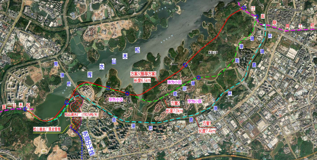 3.建设地点:工程起点位于松山湖高新区松木山水库东南角的江库联网工程原水管道末端,输水线路终点为已建松木山-莲花山应急工程箱涵头部,中途向规划新建的松山湖水厂分水。